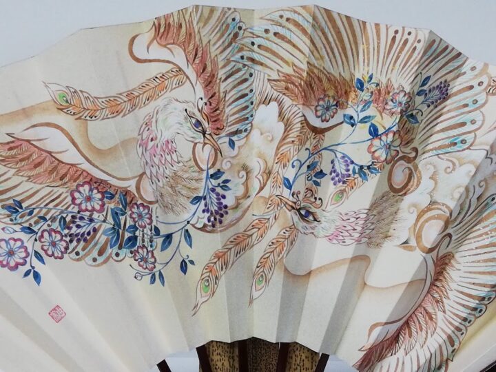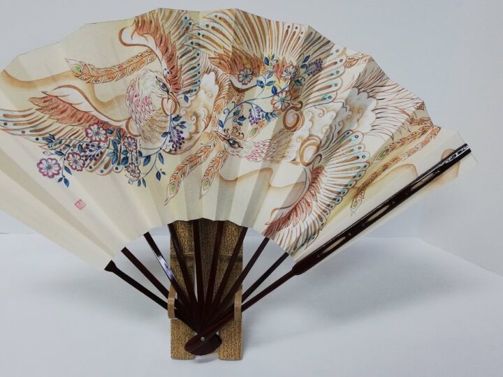 2022.11.27 Column 扇絵と 「山」と「谷」 扇絵は、平面の状態で絵を描きますが、 お扇子として仕立てあがると 「山」と「谷」の折り山が出来ます。 この 「山」と「谷」が、扇面に影を落とし、また光を当て、絵により深みと奥行きを与えてくれます。 平面上で描く時は同じ色・同じ線でも、 「山」と「谷」ができると、色・線の濃さの見え方は大きく変わります。 仕立て後の色や線の変化、金や銀での光の入れ方など、描く際に気遣う所はたくさんあり、 扇絵の奥深さと面白さ・楽しさを感じています。 「花喰い鳥ー鳳凰ー」